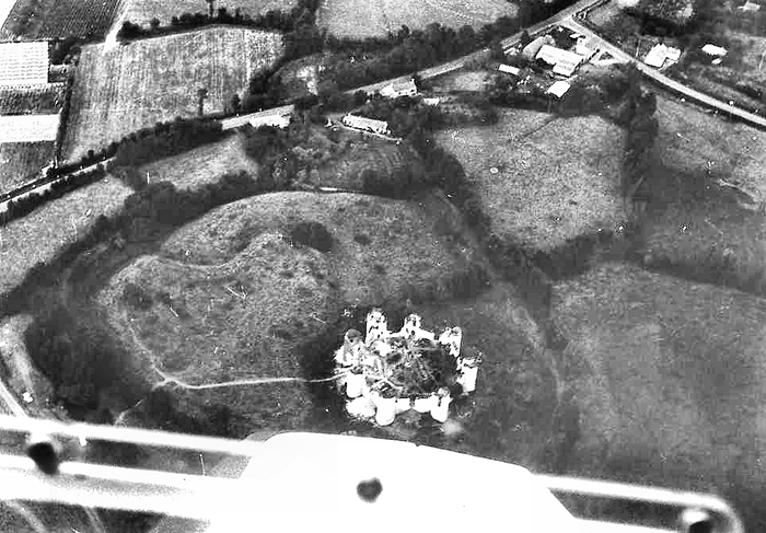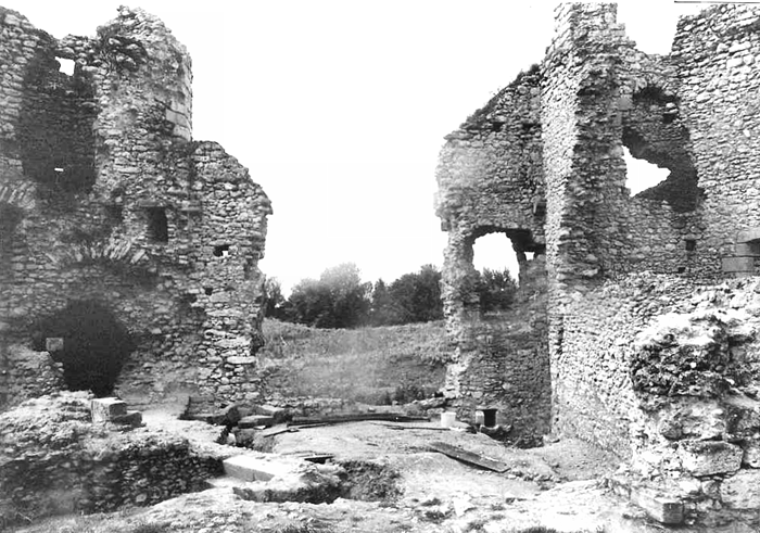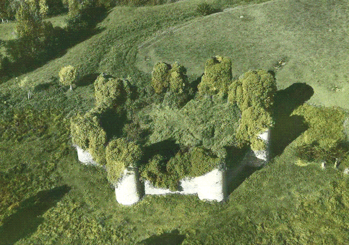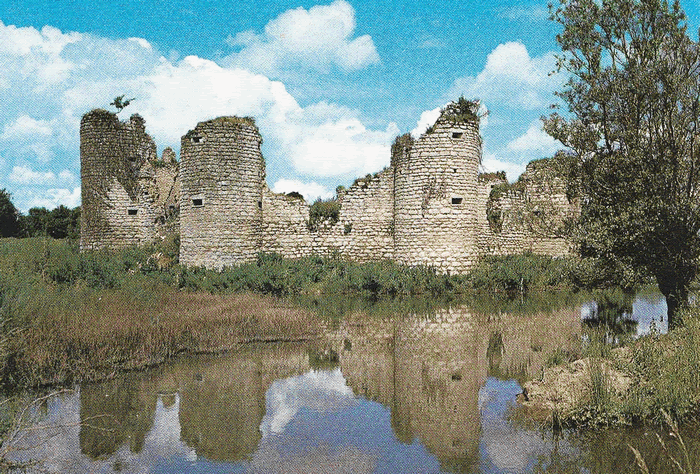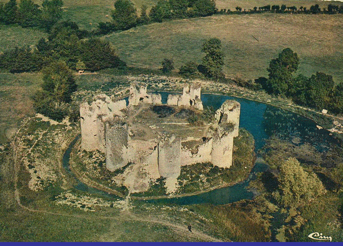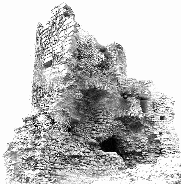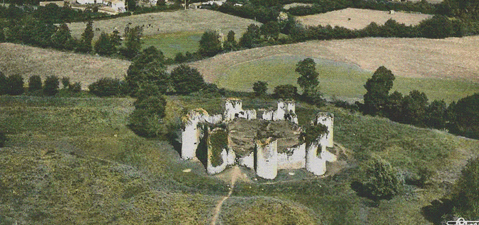 Notre réflexion: cette image est assez curieuse, ce que l'on voit c'est l'entrée du château, il n'est pas certain que ces deux tours aient eu un toit. Elle ne correspond pas à ce qu'il reste des ruines, on peut voir à l'intérieur un très haut clocher d'église, et une grande ouverture sur le côté droit qui peut être l'entrée de cet édifice, nous voyons aussi des cheminées, à par ces deux tours il n'y a aucun signe d'un château fort.