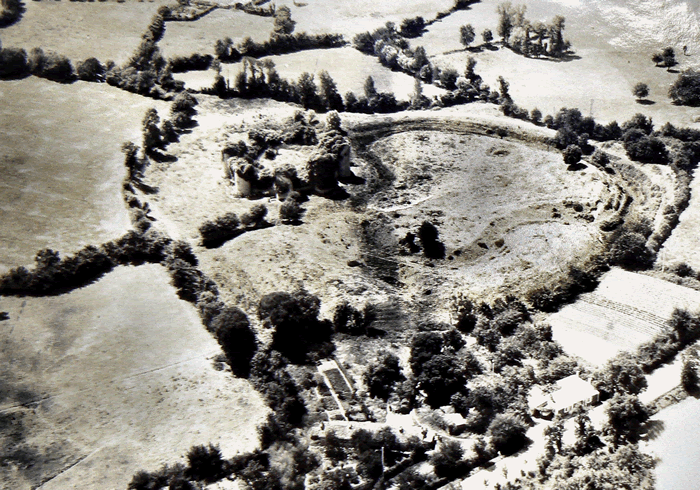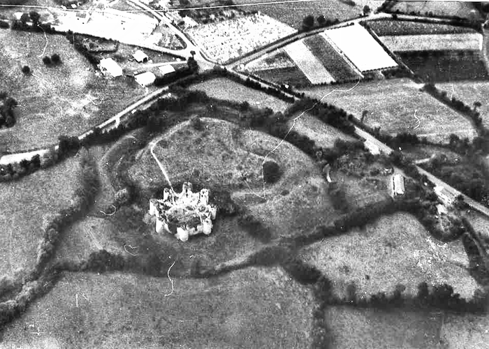 1 - Enceinte préhistorique: énorme fossé avec vallum, ne persistant désormais qu'au Nord et à l'Ouest de l'ensemble.