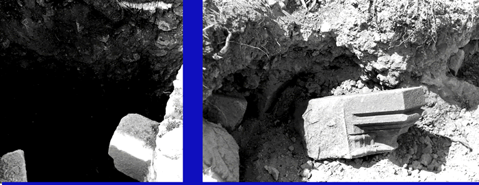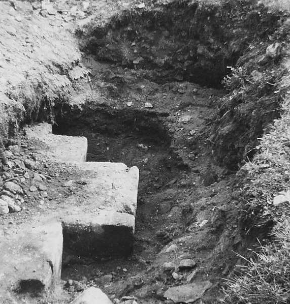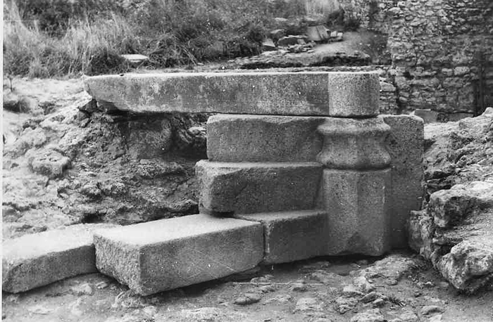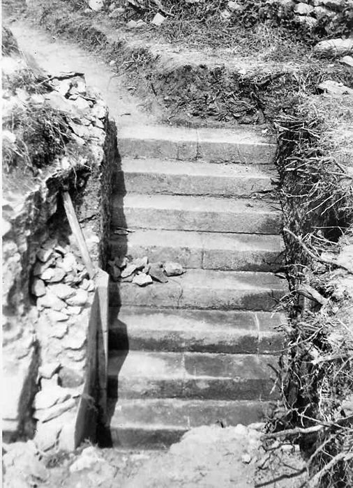 La photo vous montre l'escalier, il n'est pas encore complètement dégagé, il a 11 marches. De chaque côté vous pouvez voir, à hauteur de la huitième marche, ce qui reste d'un encadrement de pierres, en granit, travaillées pour une porte. D'après la taille des pierres, la porte ne pouvait s'ouvrir que de la salle.