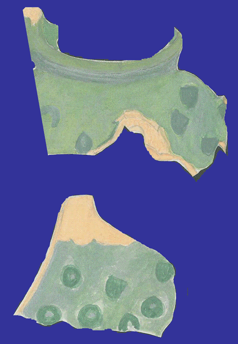 Voici les restes d'une très belle poterie dont les restes sont encore sous terre, poterie vert clair métallisé avec des tétons plus foncés