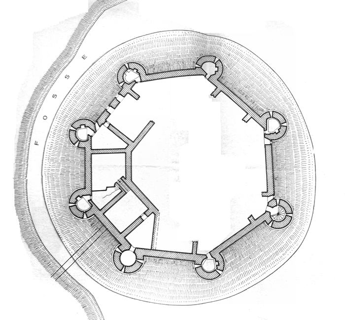 On constate l'existence, à l'intérieur de l'enceinte même, d'une construction importante ayant au moins un étage et dont la couverture était au niveau des créneaux.