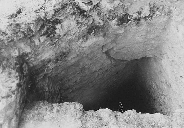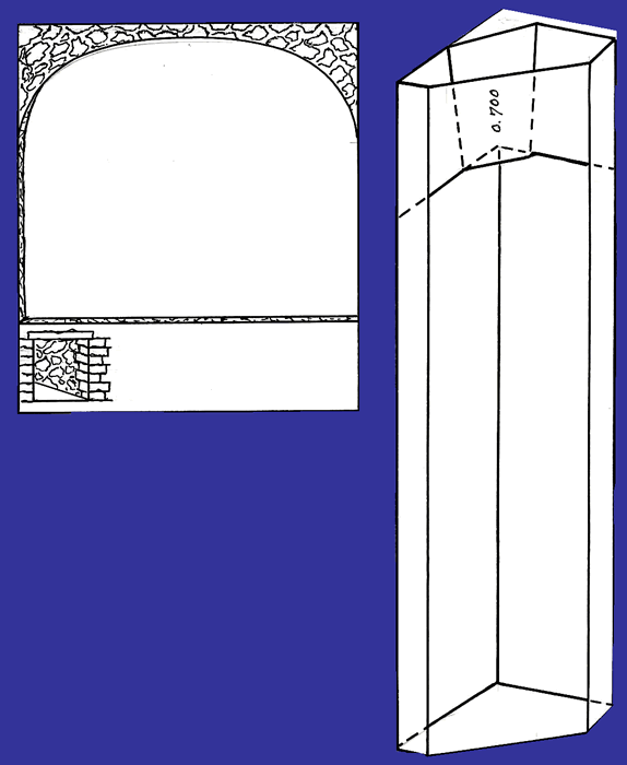 A côté, devant l'entrée de la tour, un autre trou triangulaire, profond de 5,7m de profondeur. La photo ci-dessus vous montre aussi qu'il devait se trouver une porte encadrée de pierres de granit taillées, il en reste encore une sur le sol.
