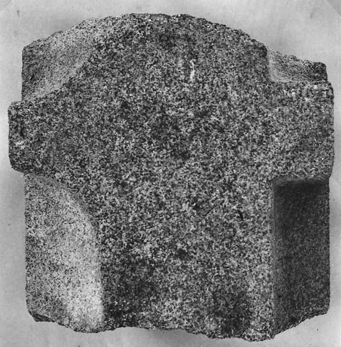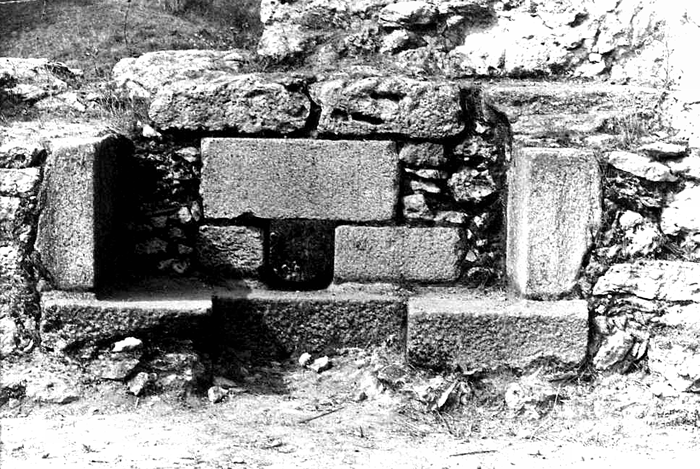 Derrière cet escalier, un trou rectangulaire ouvre sur une pièce (6m x 4m) voûtée, carrée, sur la photo ci dessous l'ouverture se trouve sous l'amas de pierres (au centre de la photo), au sol, côté courtine, un petit tunnel ouvre vers l'extérieur, il est bouché de l'extérieur et caché par la terre, de manière que nous ne pouvons pas le voir. Dans cette pièce se trouvait cette pierre de granit: