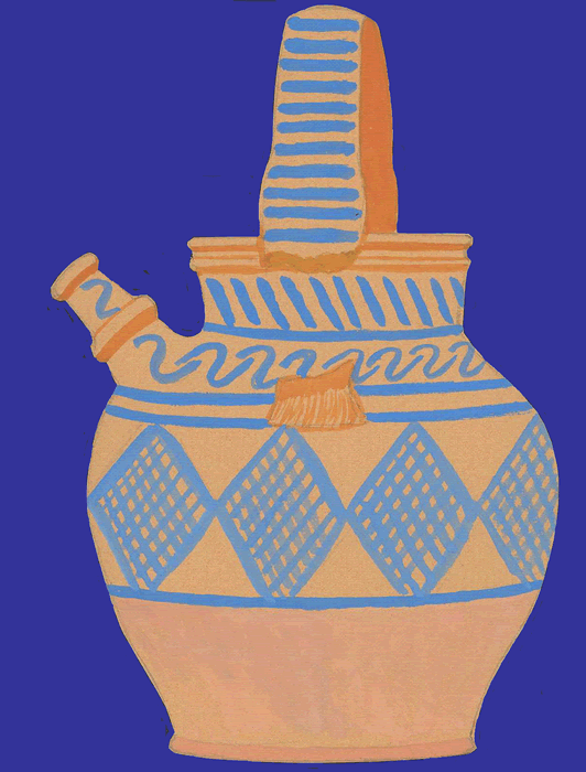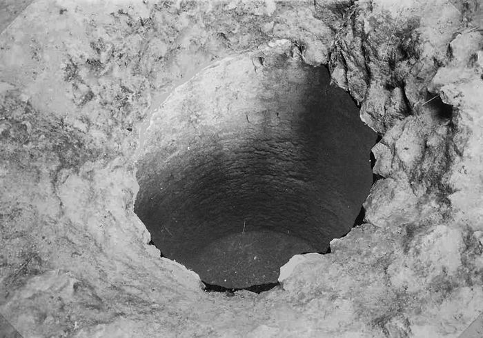 Dans ce puit (profondeur 7 mètres) nous avons trouvé: les pierres de la margelle, des morceaux de poteries, un morceau de sceau en bois, un éperon en fer, des ardoises et cet instrumen t de musique en terre vernisée vert, un cor: