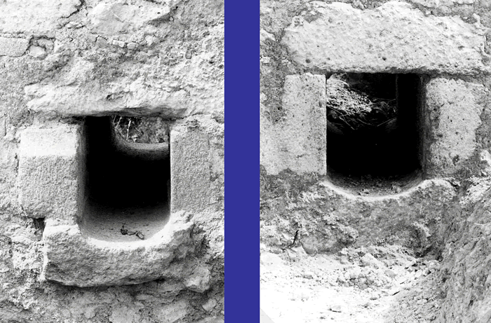 Côté intérieur, vous pouvez constater la hauteur de la courtine (qui ne doit pas être entière), sur le côté droit, au premier étage, l'emplacement d'une fenêtre. Au rez-de-chaussée, à droite, une goulotte avec une lèvre vers l'intérieur, nous en trouvons une autre, en face, donnant sur la cour intérieure du donjon, mais sans lèvre.