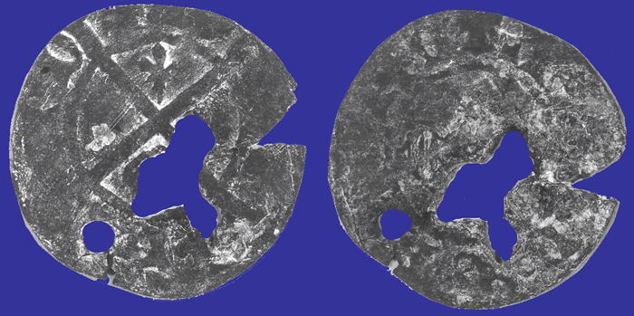 a) Un trésor de pièces de monnaie du Xe siècle découvert dans l'intérieur des fondations en 1934.