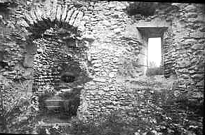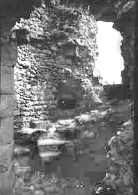 L'intérieur de la tour, la photo n'est pas bonne, mais vous pouvez voir les premières marches d'un escalier à vis qui montait au premier étage, à gauche de l'ouverture (qui devait être une fenêtre) se trouve une petite niche pour mettre une statuette.