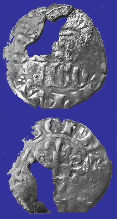 b) La trouvaille de pièces de monnaie à peu près de la même époque (Charles le Chauve, mort en 877), faites à Pierre Folles par nous même lors des fouilles de l'allée couverte (1901), parce qu'il est prouvé aujourd'hui que les débris de ce mégalithe attaqué autrefois ont été placés dans les murailles mêmes du dit château.