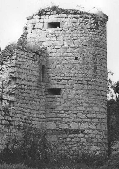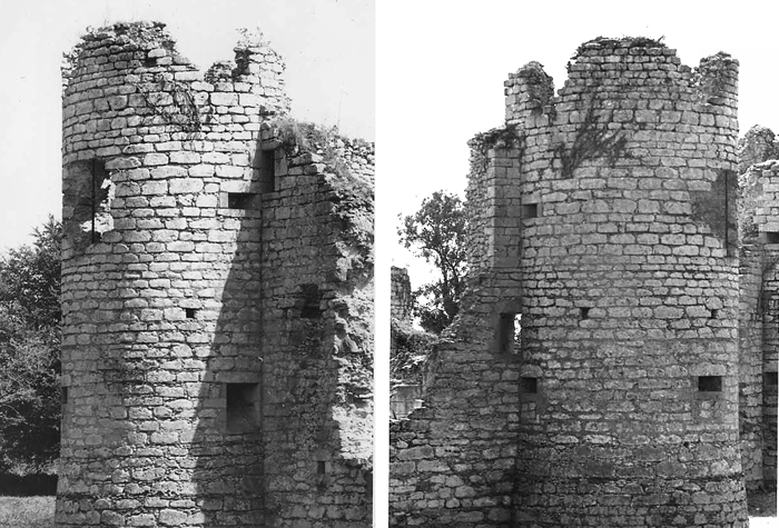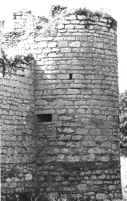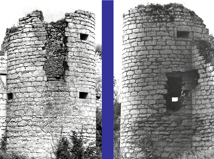 A droite de cette entrée cavalière, très haute, on voit une autre petite porte, qui est voisine de la tour Sud-Est, et qui servait exclusivement aux piétons § Si l'on admet qu'elle avait deux mètres de haut environ et un mètre de large, comme d'habitude, on peut en déduire que la grande porte avait au moins 2m50 de large et 4m de haut, avec un cintre roman 'avec courbe marquée). Sur le dessin, on note qu'elle se trouvait exactement au milieu entre les deux tours Sud-Ouest et Sud-Est, dont les créneaux sont très reconnaissables; ils étaient alors intacts. Chacune de ces deux tours, les seules visibles sur les huit constituant l'ensemble de l'enceinte féodale, on remarque deux meurtrières. La plus inférieure est à 0m80 environ du sol et devait correspondre à un canon placé au rez-de-chaussée. Elle est rectangulaire et allongée horizontalement pour permettre à la bouche de canon de se déplacer horizontalement et changer la direction du tir. L'autre, supérieure, était au premier étage de chaque tour, à la hauteur d'un mètre au dessus du plancher. Mais cette meurtrière à l'encontre de la première, était presque carrée. Au niveau de cette dernière, sur la courtine, entre les deux tours et au dessus de la petite porte aux piétons, on aperçoit une fenêtre. cela prouve que la courtine portait en dedans un premier étage.