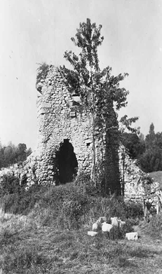 Nous allons entrée dans ce que l'on appelle le donjon, l'entrée actuelle se fait par une brèche faite dans la courtine n°1. Nous ne savons pas si cette ouverture était une porte ou si elle a été faite pour pénétrer à l'intérieur par y prendre les pierres taillées qui se retrouvent dans certaines maisons du bourg. A une certaine époque l'intérieur de ce donjon a été transformé en potager par le paysan qui louait le pré 4pour ses vaches.